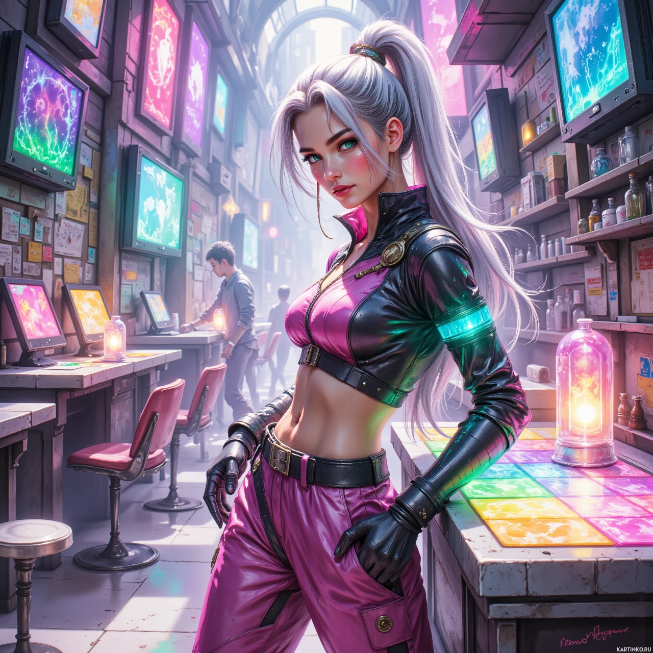 На картинке изображена стилизованный персонаж, похожий на девушку из мультфильма с белыми, заплетенными в два хвостика волосами. У неё яркая внешность: она одета в черную кожаную куртку поверх розового боди, в сочетании с розовыми кроссовками и перчатками без пальцев. Персонаж уверенно стоит на фоне неоновых огней, освещающих различные экраны с красочными изображениями. Справа от неё – фигура в темной одежде работает за монитором, а слева – кто-то сидит за рабочим местом с несколькими экранами. На заднем плане видны вывески, кассовый аппарат и другие детали, создающие атмосферу оживленного, возможно, футуристического места.