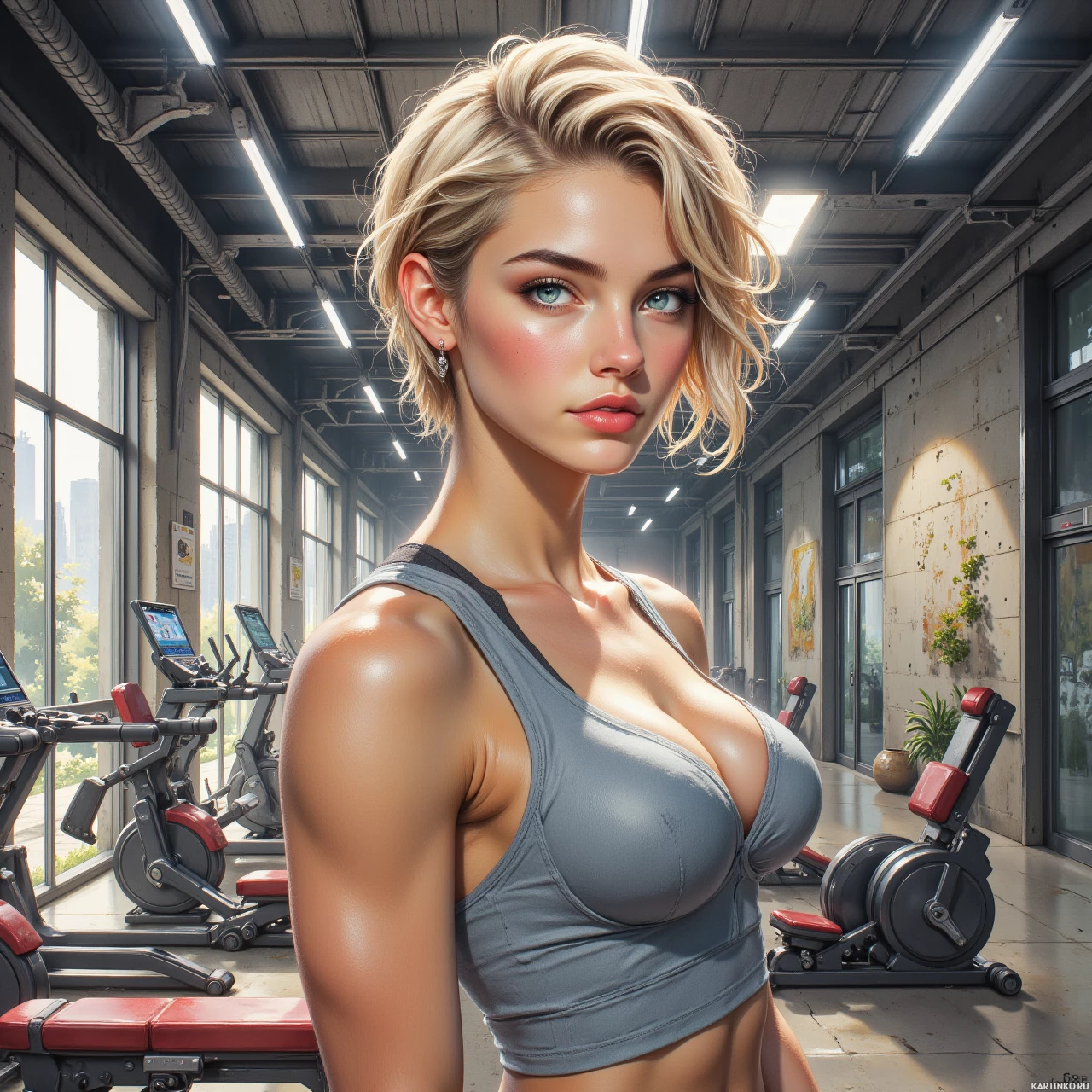 The image features a young woman standing in what appears to be a gym setting. She has short blonde hair and is wearing a sleeveless top, with visible muscle tone suggesting physical fitness. Her expression is neutral, and she is looking directly at the camera. The environment includes exercise equipment such as weight machines and exercise balls in the background.