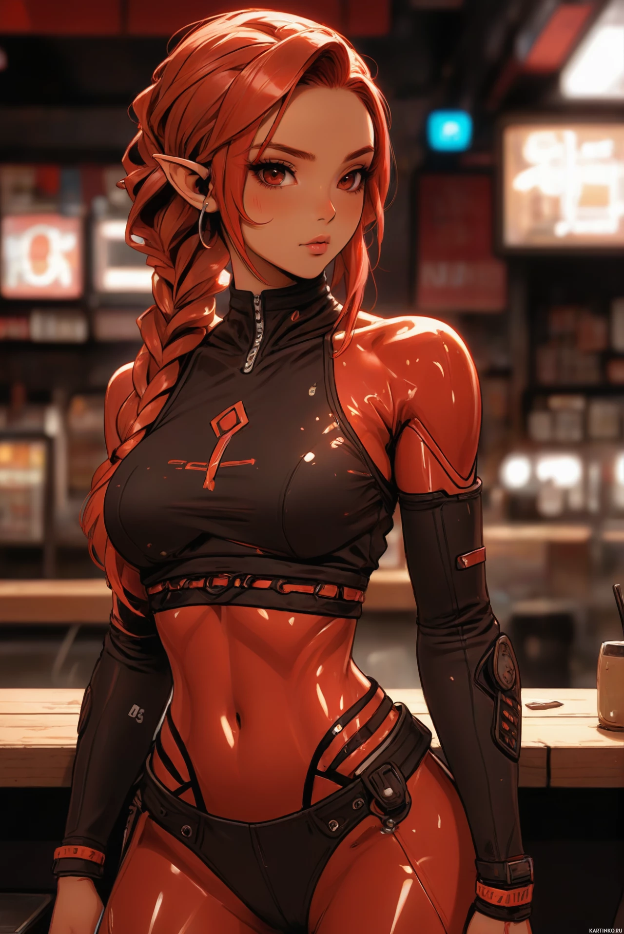 female character with red hair styled in twin tails, and she appears to be a fantasy-style elf. She is wearing red armor or bodysuit with black accents that have