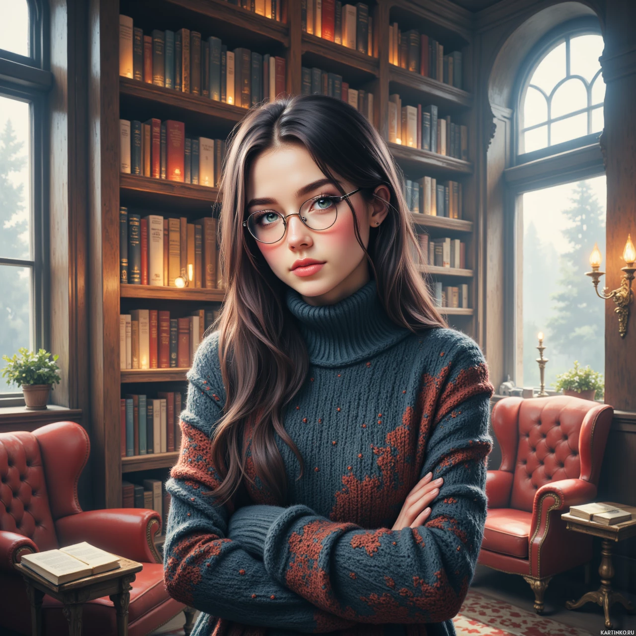 На картинке молодая женщина с каштановыми волосами до плеч, в очках и тёмном свитере с арановым узором. Она скрестила руки на груди и смотрит немного в сторону с невыразительным лицом. На заднем плане — резной деревянный стеллаж, заставленный книгами. Кажется, действие происходит в традиционном кабинете или библиотеке с деревянными панелями и классической мебелью.