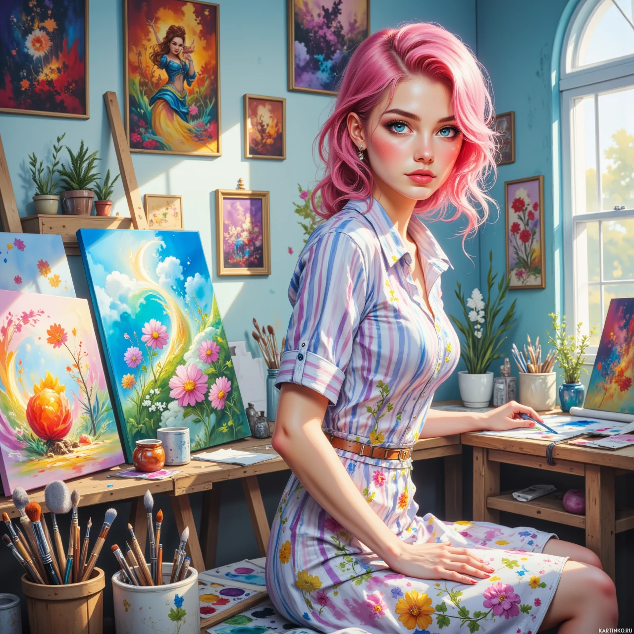 A young woman with pink hair is seated at a desk. She is wearing a floral dress and has her legs crossed. On the table, there are several paintings in various stages of completion, as well as painting materials such as brushes and palettes. There are also some decorative elements like vases with flowers on the desk. The background features framed pictures hanging on a blue wall. There is natural light coming through a window behind her.