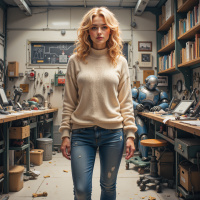 In the center of a workshop with a high ceiling, a young woman stands confidently amidst various equipment and tools scattered around her. She's dressed in a cozy beige sweater and blue denim jeans, which are slightly torn at the knees. Her hair is long, straight, and blonde, falling over her shoulders as she gazes off to one side with an expression of concern etched on her face. Behind her, a robotic arm stands ready for work.