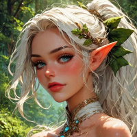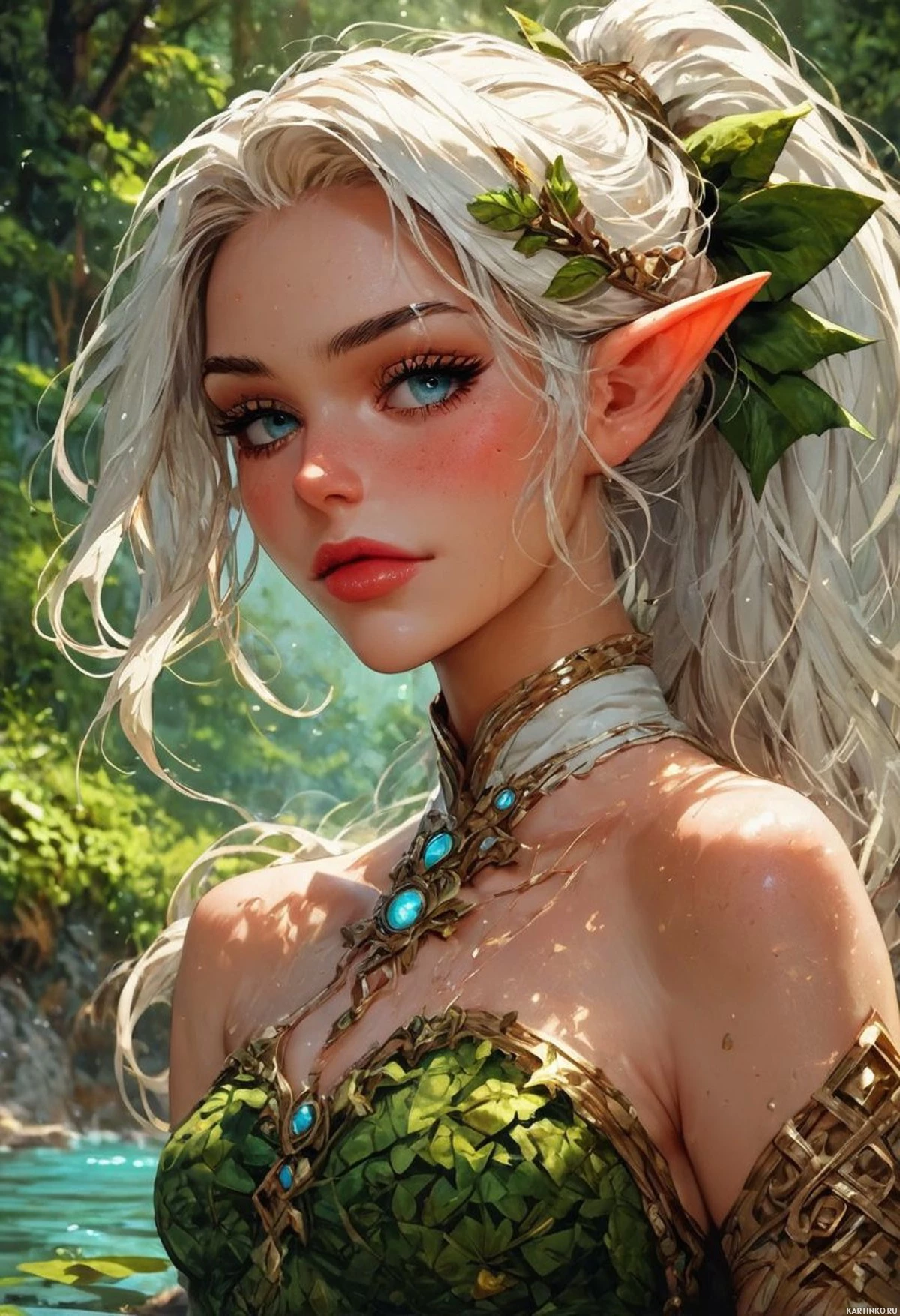 a greenish hue, reminiscent of a fantasy or elven style. Around her neck, there is