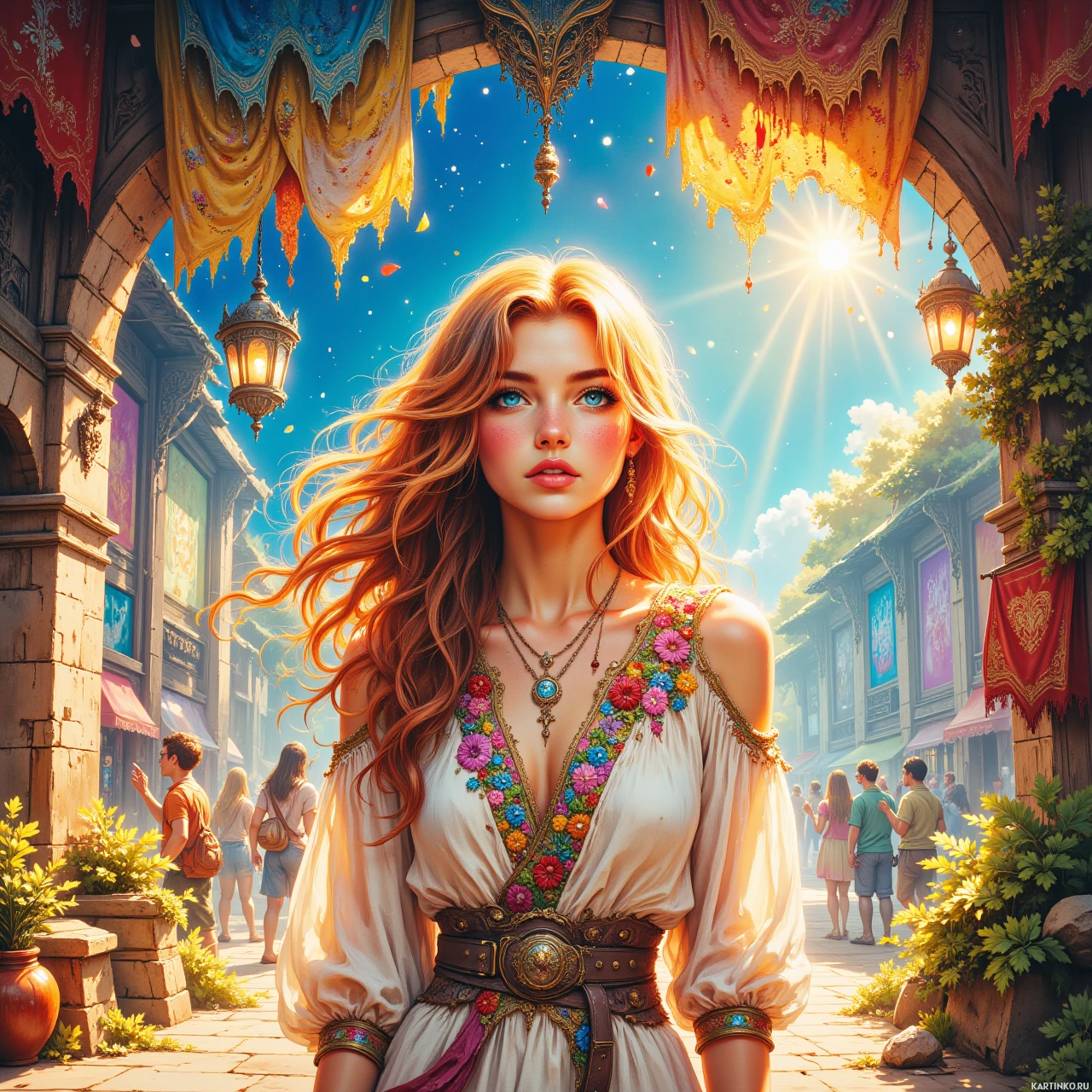 На картинке молодая женщина с длинными рыжими волосами смотрит влево. У нее высокий воротник и изящное ожерелье. На ней богато украшенный корсет с вышивкой и, похоже, головной убор или ободок с цветами. Вокруг неё – пейзаж средневековой деревни с мощёными улочками, пышной зеленью, подвешенными фонарями и солнечно-освеченным небом. За ней видны другие люди, похожие на деревенских жителей. Цвета яркие, палитра богата зелёным, коричневым, с вкраплениями золота и голубых оттенков.