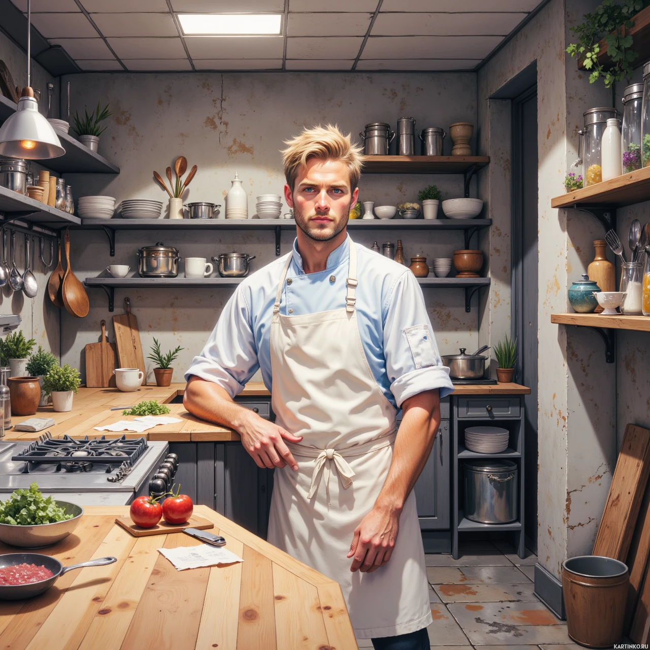 На этой картинке мы видим шеф-повара, стоящего на просторной, хорошо оборудованной кухне. На нем профессиональная одежда: поварской халат и фартук. У шефа короткие светлые волосы, и он, кажется, смотрит в камеру с нейтральным выражением лица. Кухня заполнена разнообразными кухонными принадлежностями и продуктами. На столешнице несколько мисок разного размера с неизвестными ингредиентами. Рядом с ними ложки, вероятно, использовавшиеся для перемешивания. На столе также открыта книга, возможно, сборник рецептов. Стены кухни украшены полками, заполненными банками и бутылками, в которых, скорее всего, хранятся масла, специи и другие необходимые продукты. Растения в горшках добавляют зелени и создают уютную атмосферу в профессиональном пространстве. В целом, картинка запечатлевает момент из жизни повара, возможно, во время подготовки к приготовлению блюда или в перерыве между готовкой.