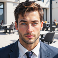 A man with a beard and short brown hair wearing a navy blue suit, white shirt, and patterned tie. He has a serious expression on his face and is looking directly at the camera. In the background there are outdoor tables and chairs, suggesting this might be an outdoor cafe or similar setting.