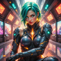 В центре футуристического пейзажа, усеянного цифровыми интерфейсами и светящимися панелями, стоит девушка с бирюзовыми волосами. Она облачена в футуристическую броню, преобладающие цвета которой – чёрный, с акцентами из металлического серого. На броне – сложные узоры и механические детали, намекающие на передовые технологии. Выражение её лица сосредоточенное, и она смотрит прямо в глаза зрителю. Фон подсвечен неоновым светом, создавая вокруг сцены неземную атмосферу.