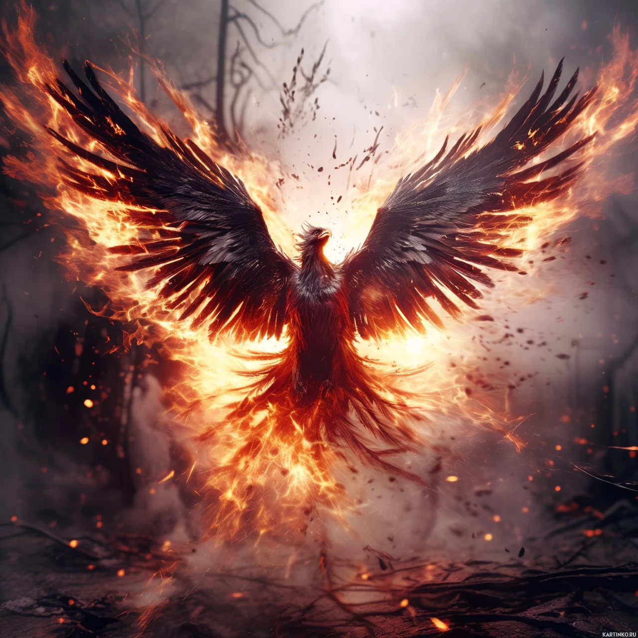a fantasy scene centered around a phoenix. The phoenix, with its wings spread wide and its body glowing with