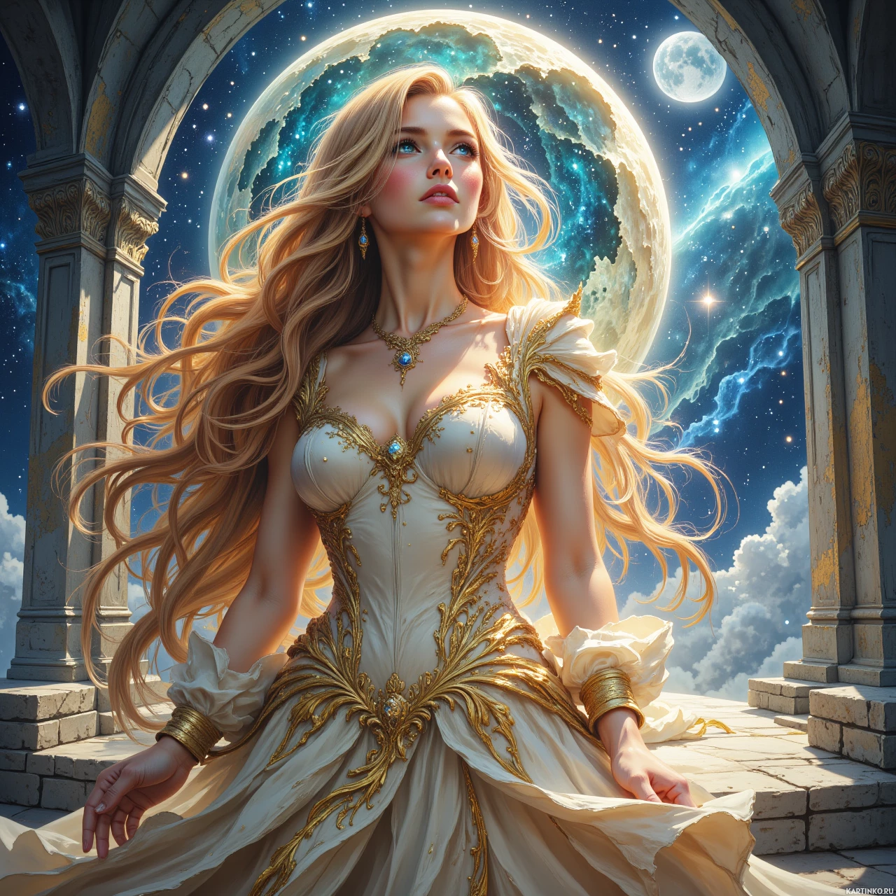 На картинке изображена стилизованная женская фигура, явно персонаж из мира фэнтези или научной фантастики. У нее длинные, струящиеся светлые волосы и роскошное платье с детальной золотой отделкой. Выражение ее лица спокойное, она смотрит вверх, к небесным светилам на фоне. Небо усыпано звездами, а на переднем плане — большая луна. По обеим сторонам от фигуры видны архитектурные элементы, напоминающие руины или арку, что подчеркивает сказочный антураж.