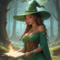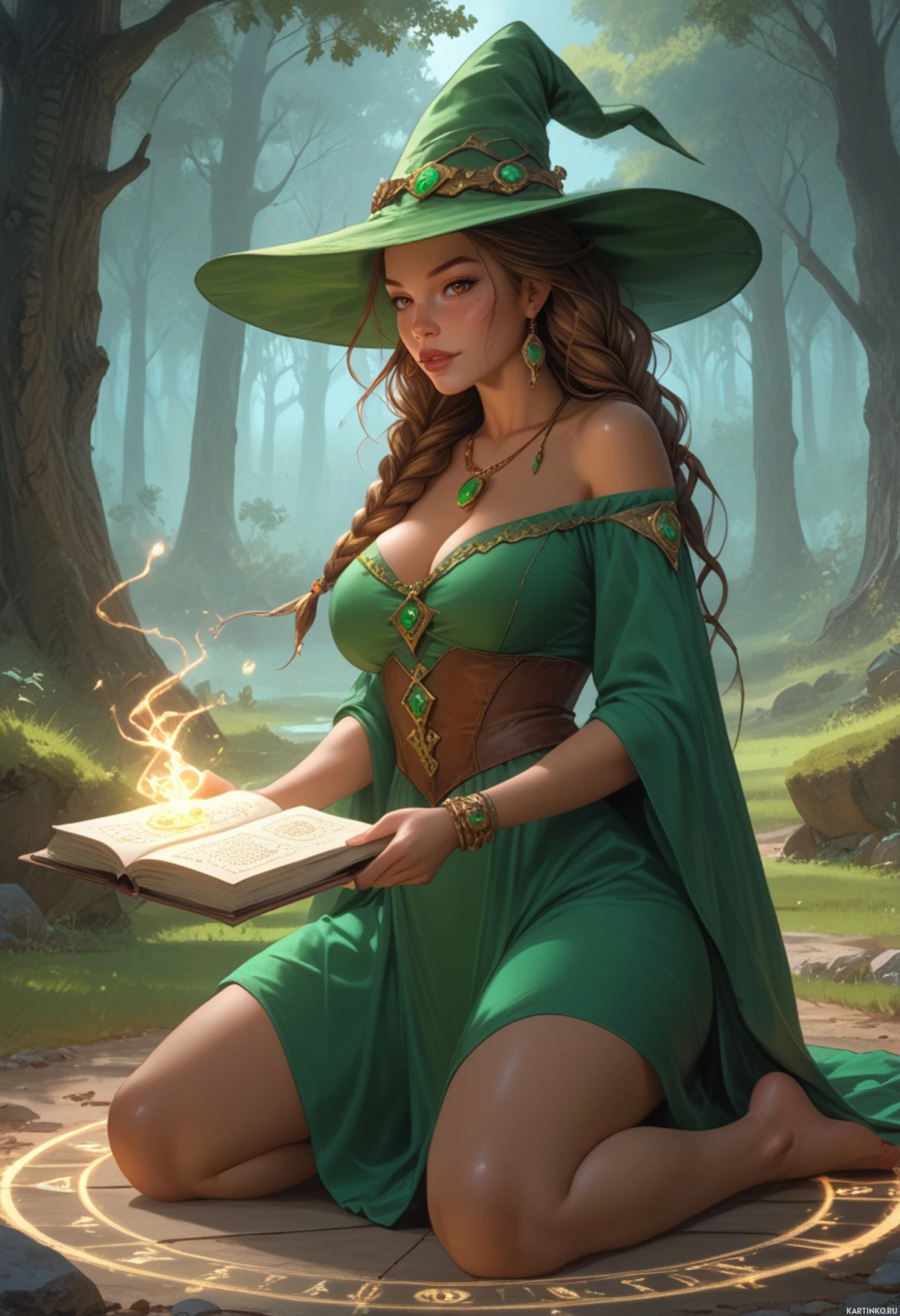 fantasy outfit with a pointed witch hat. In her hands, she holds