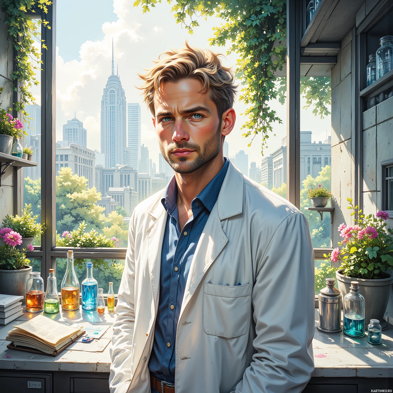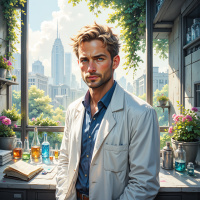 На картинке мужчина стоит перед открытым окном с видом на городской пейзаж. У него короткие волосы, на нём синее пальто с подвёрнутыми рукавами, поверх костюма – белый халат, а на глазах – очки. Взгляд мужчины направлен на зрителя, создавая ощущение вовлечённости или взаимодействия. Окружение указывает на внутреннее помещение, возможно, лабораторию или кабинет, что подтверждается наличием бутылок и микроскопом на столе рядом с ним.