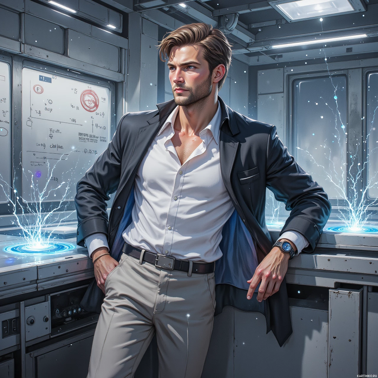 На картинке запечатлен мужчина, стоящий в помещении, напоминающем футуристическую или высокотехнологичную обстановку, возможно, интерьер космического корабля или передовой лаборатории. На нем строгий костюм с пиджаком и галстуком, что указывает на профессиональное или церемониальное мероприятие. Он непринужденно опирается на столешницу, с расслабленной рукой, лежащей на ней. На заднем плане видны панели с различными приборами и мониторами, отображающими графики и данные, что позволяет предположить, что это может быть центр управления или место проведения научных исследований.