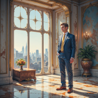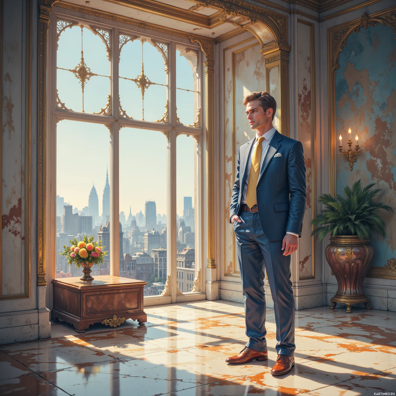 На картинке изображён мужчина, стоящий в роскошно украшенной комнате с высокими потолками и огромными окнами, из которых открывается вид на город, напоминающий Нью-Йорк. На нём костюм: пиджак, брюки, туфли и жёлтый галстук. Руки засунуты в карманы, что придаёт позе непринуждённость. Стены комнаты отделаны лепниной, потолок украшен золотом, что создаёт атмосферу богатства и величия. Слева от мужчины стоит комнатное растение, а рядом на столе, кажется, стоит ваза или цветочная композиция. Свет в комнате говорит о том, что на дворе день, благодаря яркому солнечному свету, льющемуся из окон.
