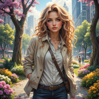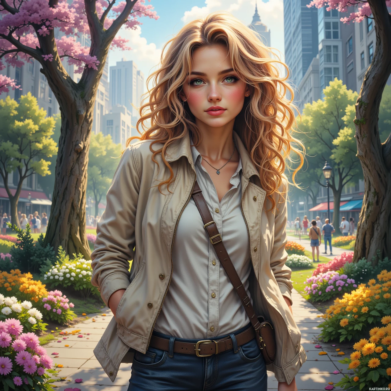 На картинке запечатлена молодая женщина с светлыми волосами, идущая по городскому тротуару. На ней бежевая куртка, через плечо перекинута коричневая сумка. Солнце ласково освещает ее лицо, она смотрит прямо в камеру. Вокруг – деревья с розовыми цветами, добавляющие нежности городскому пейзажу.