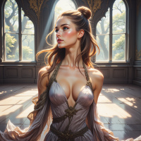 На картинке запечатлена молодая женщина в профиль. У нее длинные рыжие волосы, уложенные в легкие волны, ниспадающие на плечи. Макияж нежный и естественный, подчеркивающий черты лица, но не перегружающий их. На ней платье с мотивами древних узоров, с высоким воротником и сложными орнаментами, напоминающими классические или мифологические мотивы. У платья длинные рукава и шлейф, тянущийся по полу. Ее правая рука покоится на бедре, а левая слегка касается ткани платья. За ее спиной – арочное окно с витражами, сквозь которые проникает мягкий свет, нежно освещая ее лицо. На заднем плане – интерьер, возможно, старинное или историческое здание, судя по архитектуре и стилю окна.