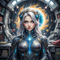 Картинка изображает женщину с белыми волосами и бледной кожей, выполненную в научно-фантастическом стиле. У неё выразительные голубые глаза, и она одета в сложный доспех, сочетающий традиционные и футуристические элементы. На доспехе видны металлические детали, включая, похоже, электронные компоненты или устройства, интегрированные в него. Задний план указывает на высокотехнологичную среду с различными панелями управления и экранами. Героиня стоит перед центральным устройством, напоминающим панель управления космического корабля, с синим светящимся ядром в центре и множеством кнопок и переключателей вокруг него. На заднем плане также изображены небесные тела, такие как планеты и звёзды, что указывает на космическую тематику или сеттинг для роли персонажа. Преобладающая цветовая гамма – холодные тона, в основном синий и белый.