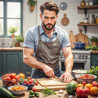 На картинке запечатлен мужчина, стоящий, похоже, на кухне. На нём фартук, короткие тёмные волосы и лёгкая небритость. Его взгляд сосредоточен и задумчив, он смотрит на продукты, которые готовит. Кухонная столешница вокруг него завалена ингредиентами, среди них – несколько свежих овощей, например помидоры, огурцы и болгарский перец, а также целая курица и другие неопознанные предметы. На столешнице – миски, ложки и ножи, что говорит об активном приготовлении пищи. На заднем плане – открытые полки с кухонной утварью, посудой и дополнительными ингредиентами, такими как связка трав, подвешенная в банках. Освещение яркое, цвета насыщенные, что указывает на внутреннее пространство в дневное время.