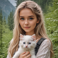 blonde hair and is looking directly at the camera with a soft expression. The woman is holding a white cat with distinctive