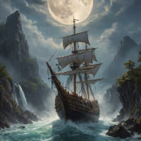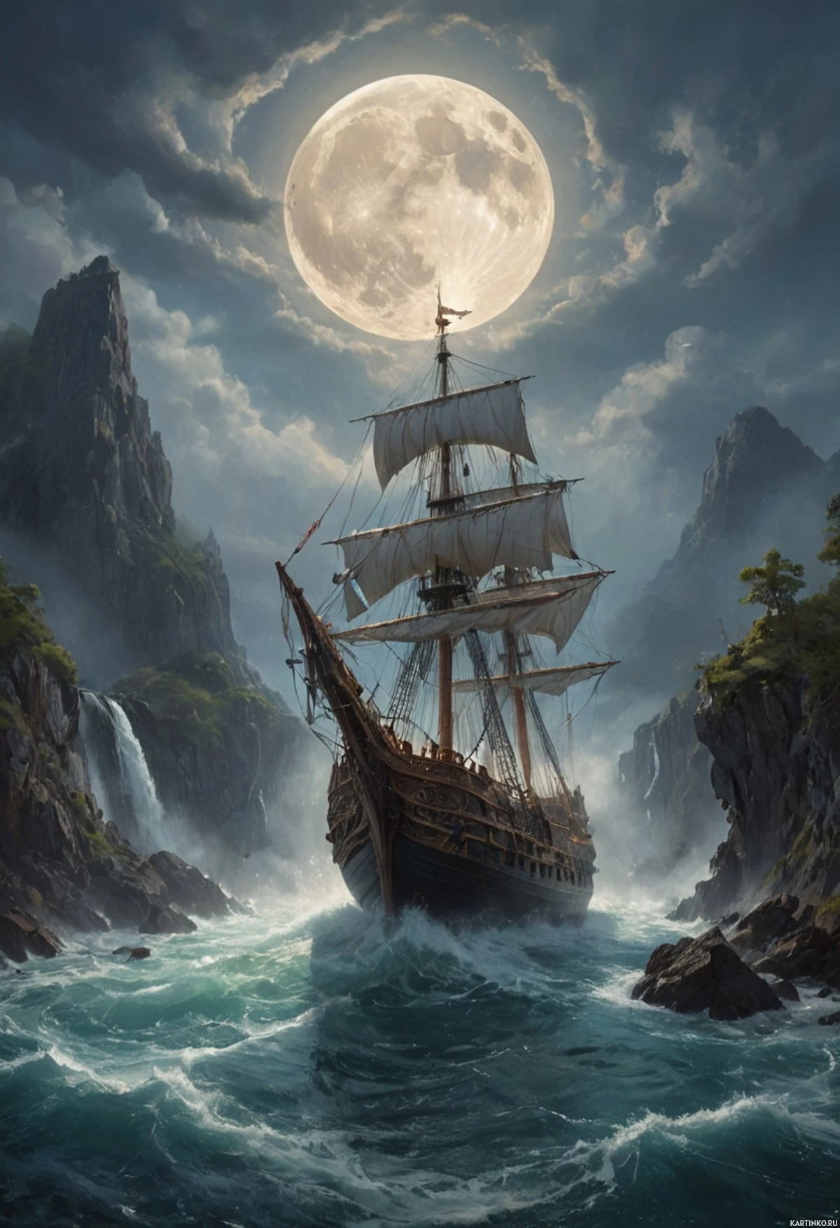 sailing ship at sea, with dramatic skies overhead that suggest either dawn or dusk due to the presence of light in the sky. There are towering cliffs on either side of the ship, which contribute to an impression of