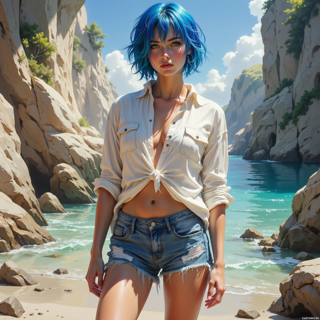 На картинке изображена молодая девушка с ярко-синими волосами, стоящая на краю скалистого берега. На ней белая рубашка, распахнутая сверху, и джинсовые шорты. На заднем плане – чистое небо с облаками над бескрайним водным простором.