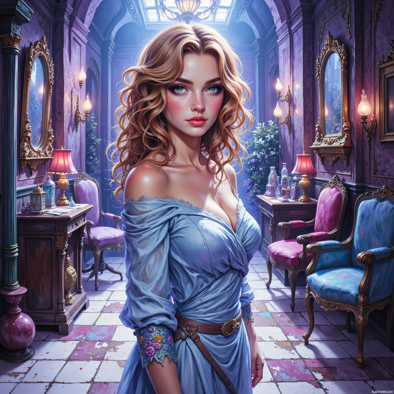 На картинке молодая женщина с золотистыми волосами, украшенными цветами, стоит в комнате, пропитанной очарованием старины. На ней голубое платье с золотой отделкой и белыми кружевными манжетами. Вокруг нее – изысканная мебель, включая кресла и диваны, расположенные вокруг камина, виднеющегося вдали. За ее спиной стена покрыта зеркалами, отражающими свет настенных свечей. Она стоит перед дверью, обрамленной арками, что придает сцене классическую атмосферу.