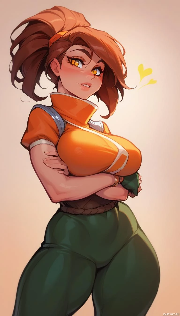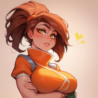 red hair, and she is depicted in a pose that suggests she is holding her hand up near her mouth as if she's about to say something or has just said something. She is wearing a bright orange top with a green collar, paired with