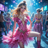 The image features a woman who appears to be dancing. She has blonde hair and is wearing a pink dress with a glittery texture, paired with high heels. The setting suggests a lively urban environment, possibly a nightclub or street party, as indicated by the presence of bright lights and other people in the background who are also dressed up for an event. There's confetti visible in the air, contributing to the festive atmosphere.