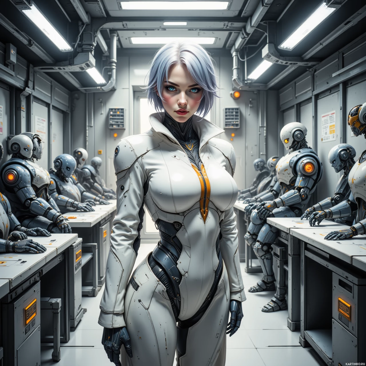 In the image, a girl with white hair stands in a room filled with robotic entities. She is dressed in a futuristic suit that seems to be a blend of human form and machine parts. The background features walls with various controls and monitors, indicating a high-tech setting. The robots around her are also designed with a humanoid shape, suggesting they might have some level of intelligence or interaction capabilities. The overall scene conveys a science fiction theme, where the blend of humanity and technology is explored.