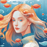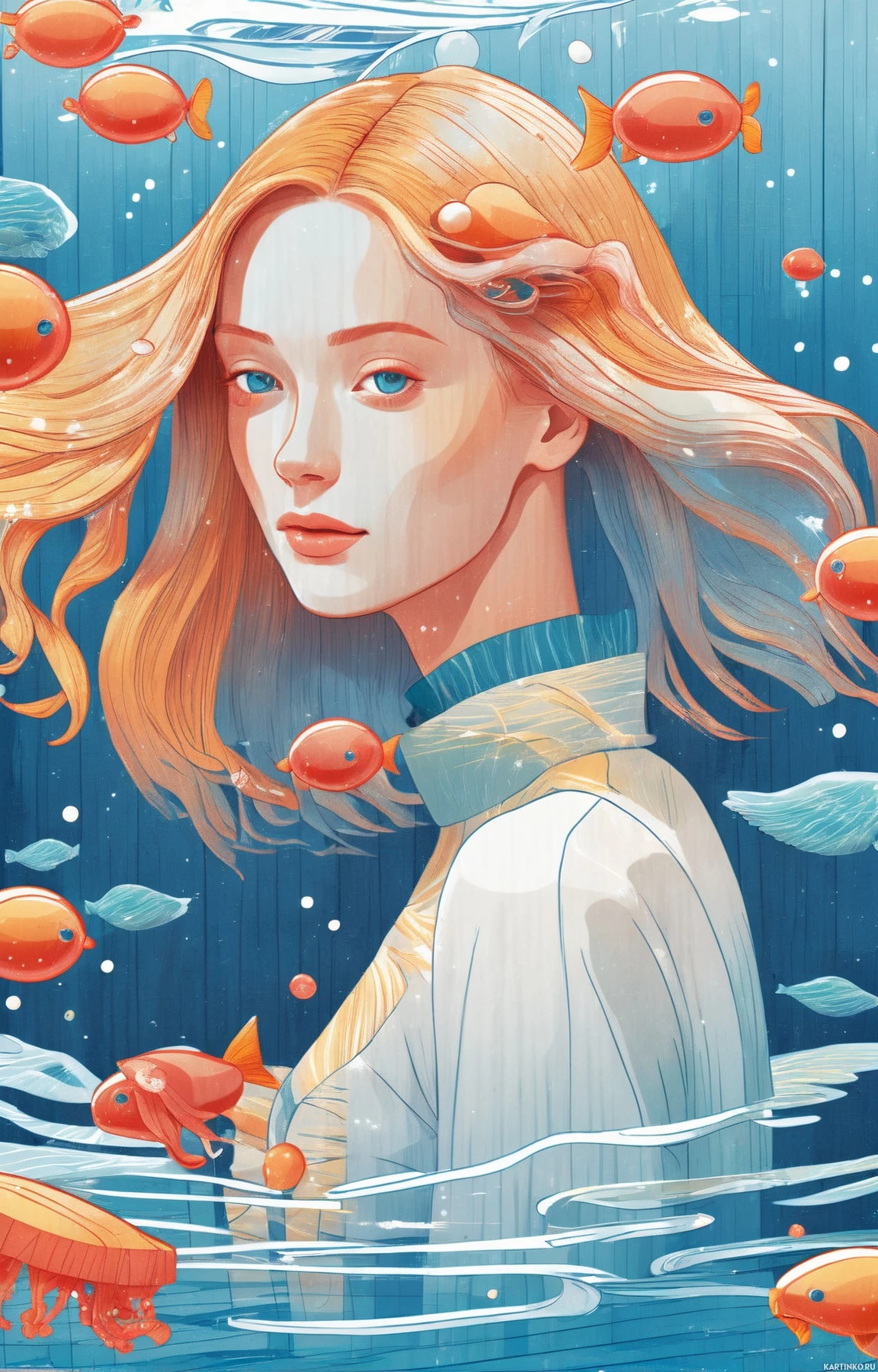 blonde hair, who appears to be underwater or surrounded by water. She has