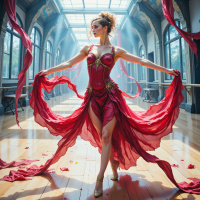 На картинке – девушка уверенно стоит в танцевальном зале, изящно подняв руки и повернув голову в сторону. На ней – яркое красное платье с длинной, струящейся тканью, ниспадающей с плеч. Танцевальный зал вокруг неё, кажется, пронизан духом движения и творчества, а зеркала отражают свет, льющийся из больших окон по обе стороны комнаты.