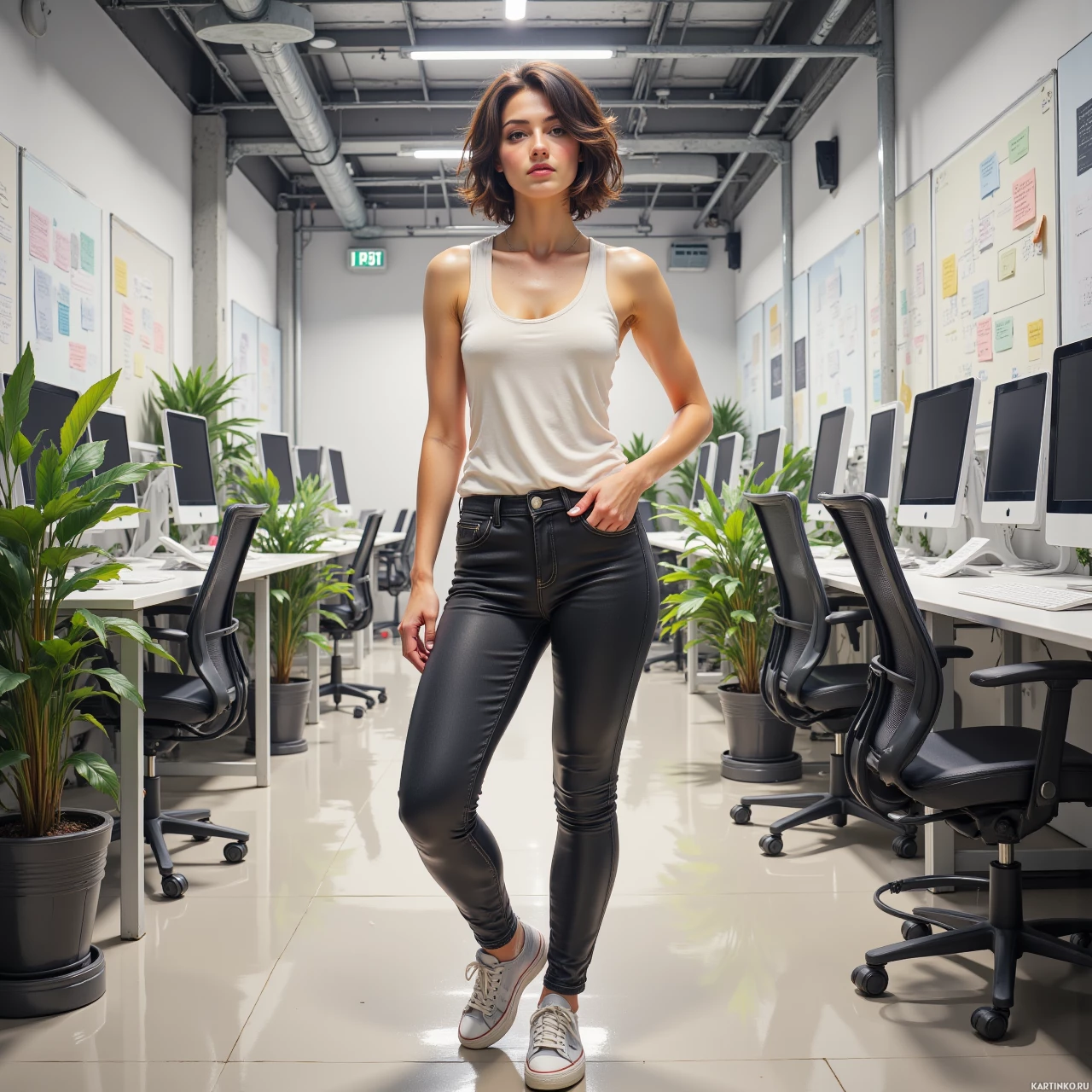 A woman wearing a white tank top and black pants, walking in an office environment with modern decor, including plants and a large screen displaying various notes and diagrams.