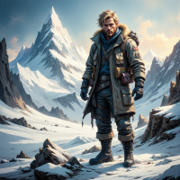 Это цифровая картинка, на которой изображён мужчина, стоящий на заснеженной местности с каменистыми выходами. На нём тёплая одежда, и он выглядит как заядлый путешественник. Видно, что он одет для холодной погоды: тяжёлый пуховик, перчатки, сапоги. На спине у него снаряжение и припасы, похоже, винтовка или ружьё. Выражение лица говорит о готовности и решимости. На заднем плане – заснеженные горы под ярким небом, создающее ощущение приключения и исследования на природе.