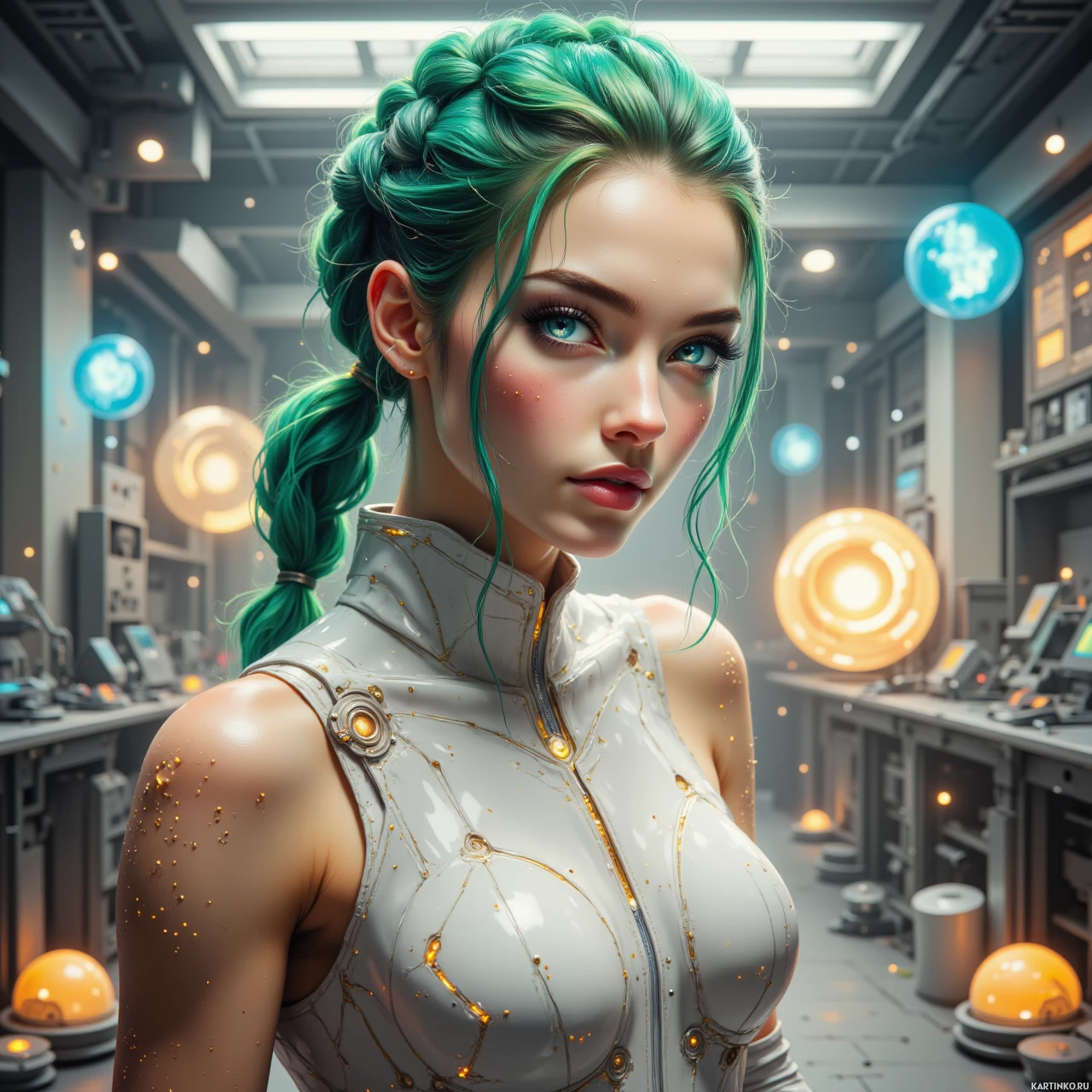 На картинке изображена стилизованный портрет молодой женщины с необычными зелеными волосами, заплетенными в сложную косу. У нее голубые глаза, а выражение лица серьезное и задумчивое. На ней облегающий, футуристичный белый наряд, похожий на броню или специальную одежду, предназначенную для практичности, а не для моды. Фон предполагает высокотехнологичную среду, возможно, лабораторию или космическую станцию, судя по наличию передовых механизмов и экранов. Освещение мягкое, с оттенками синего и белого, что создает ощущение неземной атмосферы.