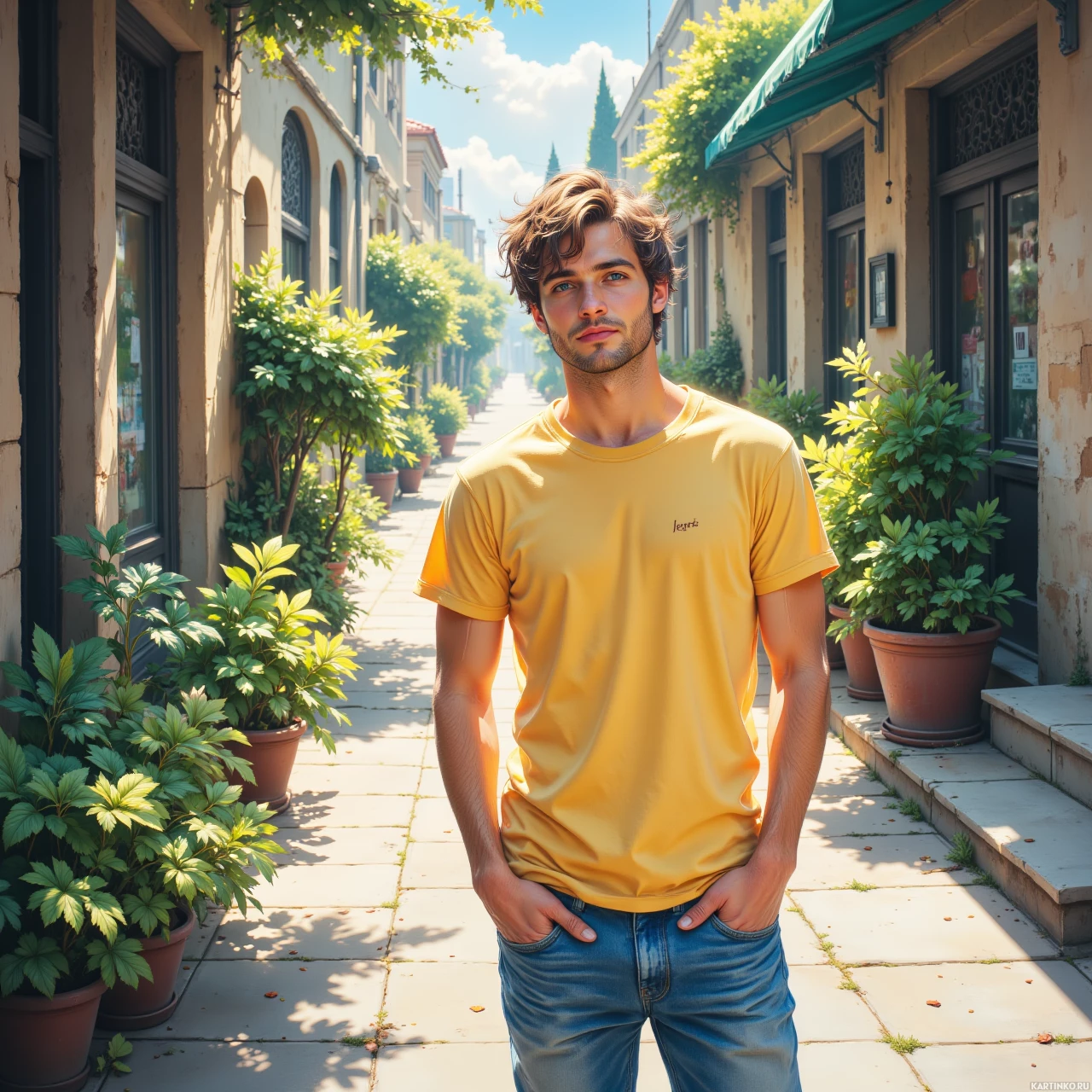 На картинке молодой человек стоит в центре каменной дорожки, по обе стороны которой выстроились горшки с растениями. На нём повседневная одежда: яркая жёлтая футболка и синие джинсы. У него взъерошенные волосы, и он смотрит прямо в камеру с расслабленным выражением лица. Поза выдаёт, что он, возможно, позирует для фотографии. Над ним чистое небо с редкими облаками, что говорит о хорошей погоде. Дорожка, похоже, является частью городской улицы, возможно, в средиземноморском климате, судя по сочной зелени.