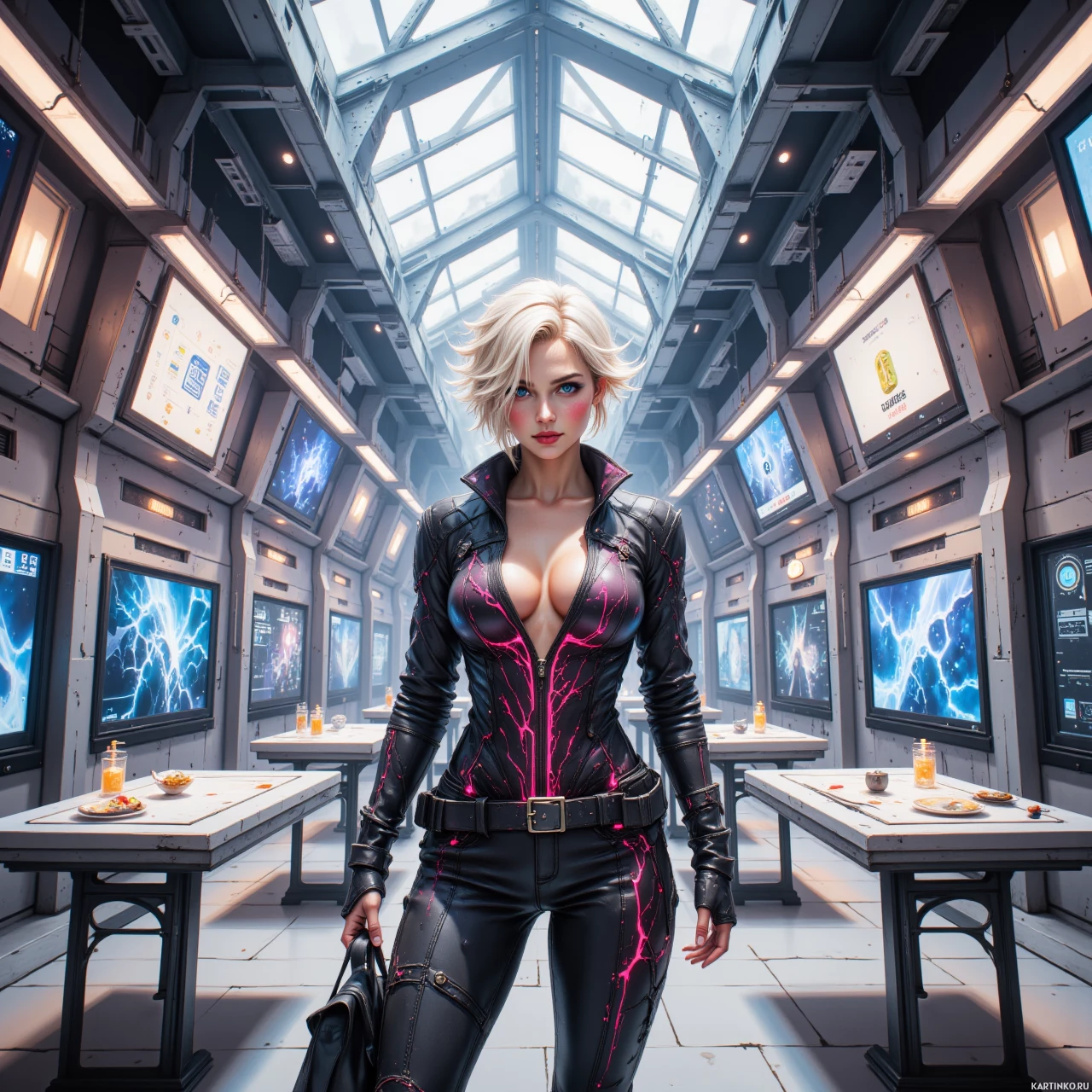 На картинке женщина с белыми волосами уверенно стоит в футуристической лаборатории. На ней чёрно-розовый комбинезон – обычный наряд для супергероев. Лаборатория оснащена экранами и разнообразными научными приборами, что указывает на передовые технологии. Освещение приглушённое, но благодаря центральному расположению в кадре, женщина становится ключевым элементом. Её поза и выражение лица выдают готовность к действиям или приключениям.