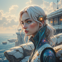 На картинке запечатлена молодая женщина с белыми волосами и пейзажем побережья на заднем плане. У неё поразительные голубые глаза, а макияж включает металлические акценты на щеках. На ней футуристический наряд, вдохновленный морской жизнью, с элементами, напоминающими кораллы или раковины. Одежда выглядит как облегающий комбинезон, украшенный деталями, создающими впечатление снаряжения для подводных исследований, включая устройство на правом ухе, которое можно интерпретировать как звуковой преобразователь или коммуникационное устройство, характерное для будущих морских экспедиций. Женщина расположена на фоне скальных образований и строения, похожего на прибрежное здание, что может указывать на то, что она стоит на краю обрыва, с видом на океан. Освещение на картинке мягкое, тени свидетельствуют об окружении, освещенном естественным светом или при тусклом освещении, а не резким искусственным.