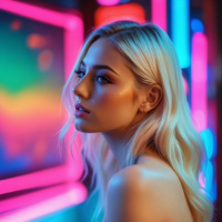 defined eyebrows and shimmering eyeshadow. In the background, there are vibrant light displays that give off