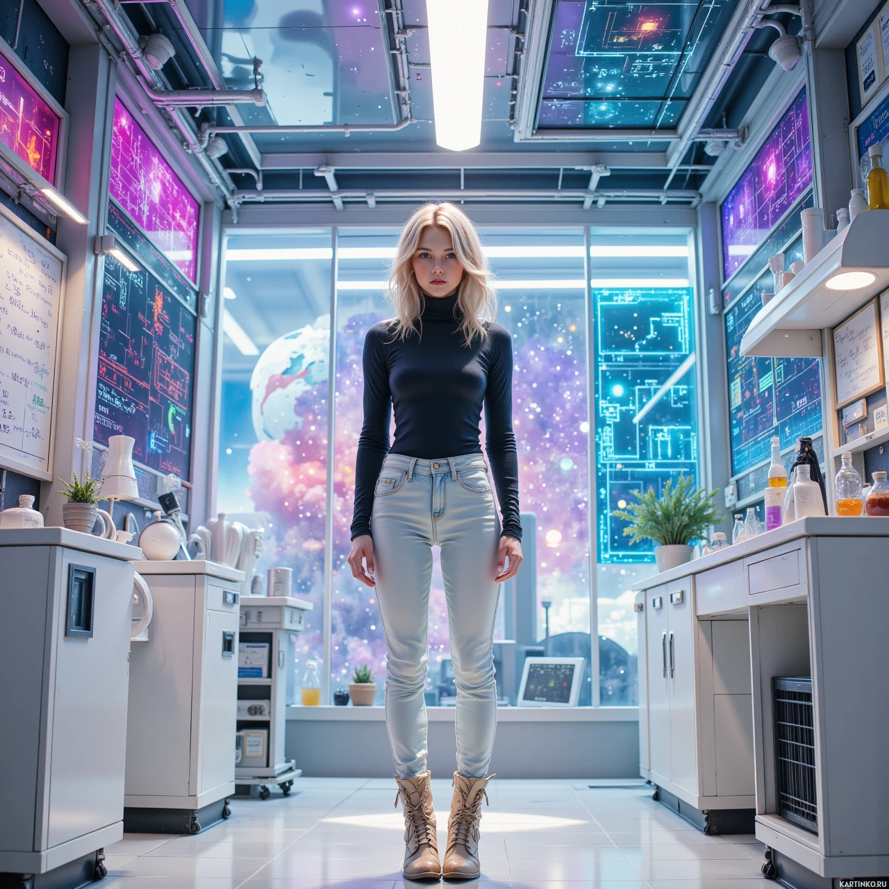 На картинке запечатлена молодая женщина, стоящая в комнате с футуристическим дизайном. У нее светлые волосы, и она одета в повседневную одежду, включая джинсы. Вокруг нее – высокотехнологичные устройства и экраны, на которых отображаются звездное небо и, возможно, данные или изображения, связанные с космосом. На заднем плане – большое окно, из которого открывается вид на ночное небо, освещенное северным сиянием. Внутреннее убранство комнаты выдержано в современном стиле, с гладкими поверхностями и синей подсветкой.