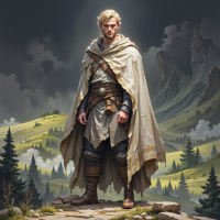 На картинке изображен мужчина, стоящий в живописном пейзаже. На нем доспехи и плащ, что наводит на мысль о фэнтезийном или историческом сеттинге. Его поза уверенная, руки свободно опущены вдоль тела. На заднем плане видны пологие холмы, поросшие растительностью и усеянные каменными выступами, что подчеркивает открытое пространство.