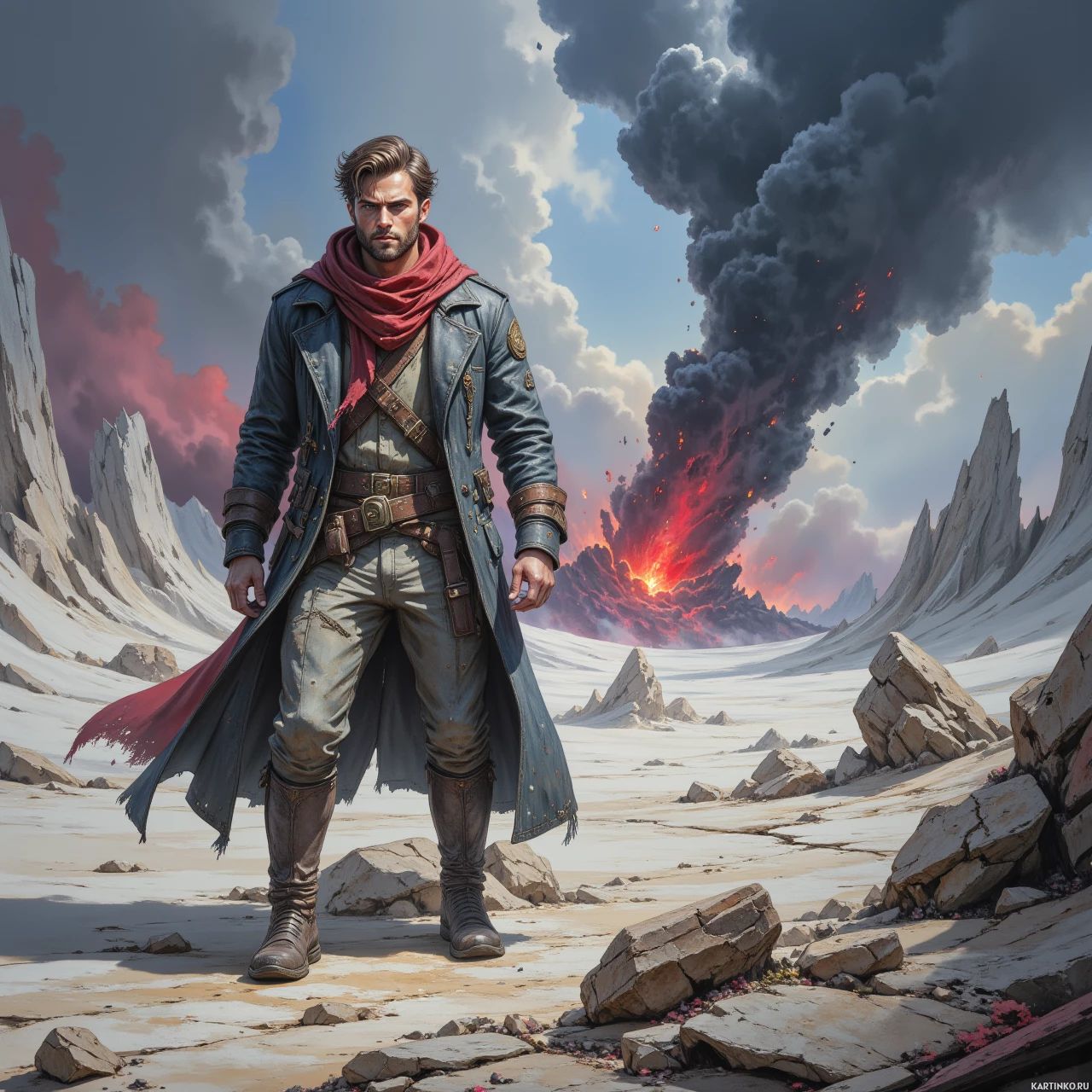 На картинке мужчина уверенно стоит на переднем плане на фоне впечатляющего пейзажа. На нём коричневая куртка, а вокруг шеи – красный шарф. Его взгляд направлен в сторону, будто он что-то замечает за пределами кадра. За его спиной простирается безжизненная местность. Самый яркий элемент – мощный взрыв, вырвавшийся из земли вдалеке, с огненным столбом и густым дымом, взмывающими в небо. Картина передаёт ощущение опасности и приключений.