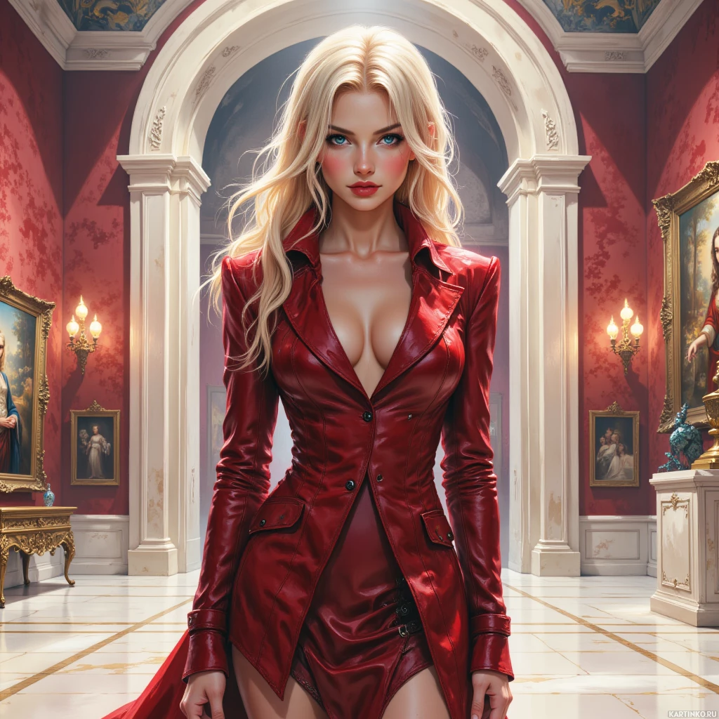 На картинке изображена женщина с золотистыми волосами и пронзительными голубыми глазами. Она с грацией стоит в центре комнаты, стены которой украшены в красных тонах, а декоративные элементы намекают на роскошь. На ней облегающая красная куртка и черный топ, открывающий живот, что говорит о смелости или, возможно, о привычке носить вызывающую одежду. Её выражение лица нейтральное, но сосредоточенное, словно она стоит перед важным решением или действием.