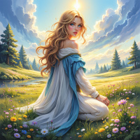 На картинке молодая женщина с светлыми волосами сидит в поле, усыпанном цветами и травой. На ней длинное белое платье, касающееся земли, она стоит спиной к зрителю, глядя на залитый солнцем пейзаж. На заднем плане – деревья на фоне ясного неба, что навевает мысли о весне или начале лета, учитывая цветущие деревья и яркий свет.