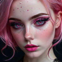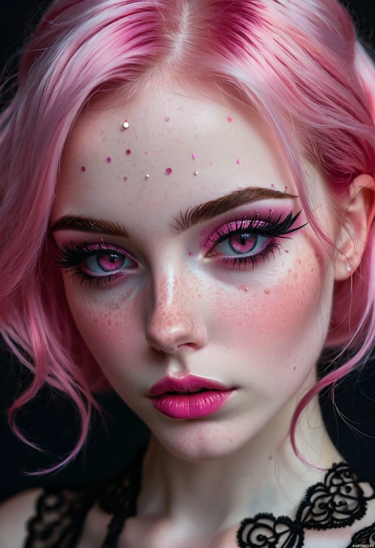 female character with pink hair. Her makeup is dramatic, featuring vibrant