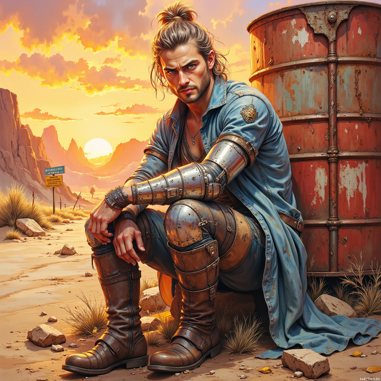 The image features a man sitting on a rocky ground with desert-like surroundings. He is wearing armor that appears to be rusted, suggesting an older or worn appearance. His left hand is resting on his hip and he has his right elbow propped up on his knee. In front of him, there's a large barrel that seems weathered as well, with visible rust and paint peeling off. The backdrop includes what looks like a mesa or plateau under the orange hues of either sunrise or sunset.