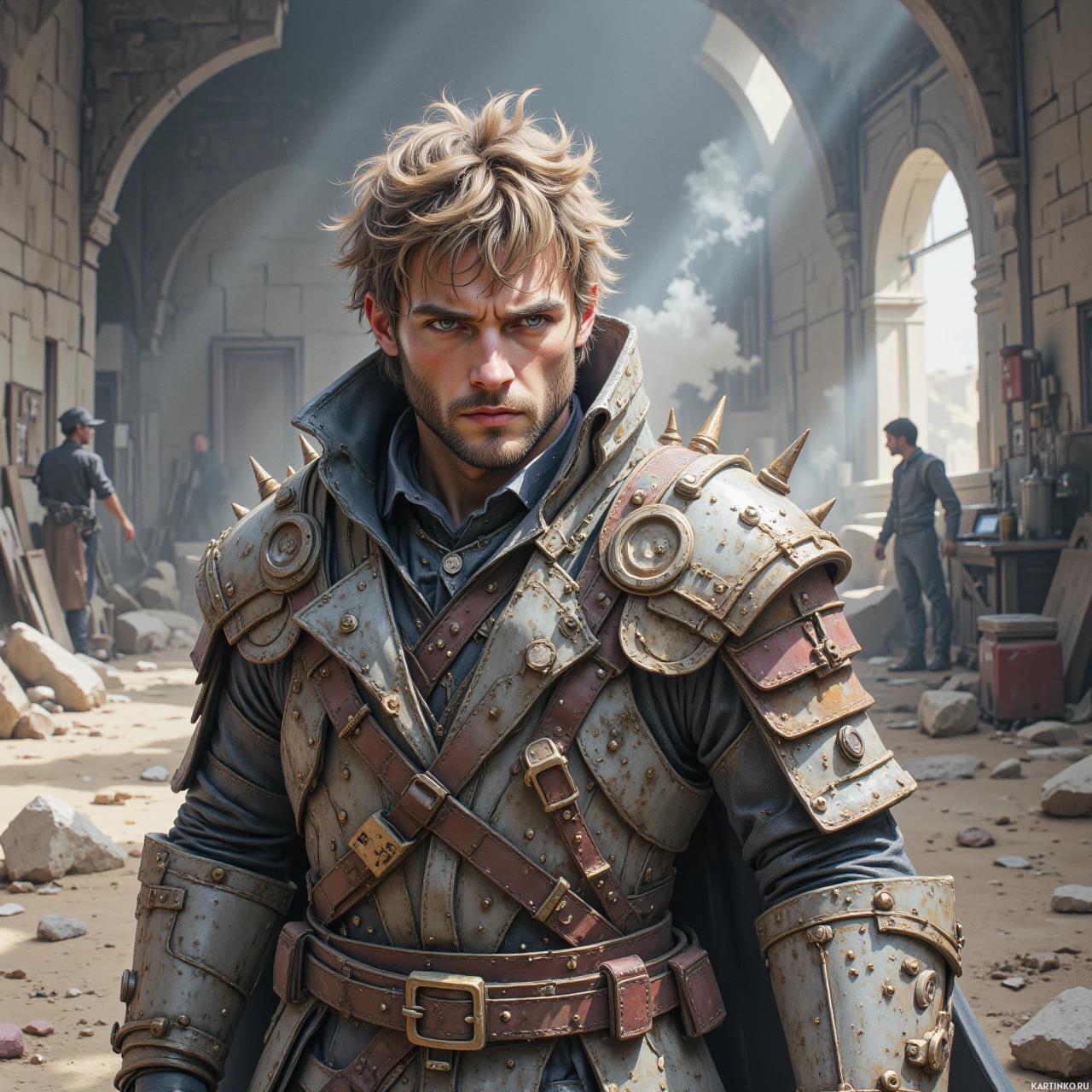 На картинке мы видим воина, стоящего в пыльной комнате, которая кажется подземной. Комната с каменными стенами и высоким потолком с арками по обе стороны. По всей комнате разбросаны различные инструменты и оборудование, что говорит о том, что это может быть мастерская или склад для оружия и доспехов. Воин одет в полный комплект доспехов, которые выглядят так, будто ими долго пользовались – на их поверхности видны потёртости и отметины. Доспехи состоят из нагрудника, наплечников, шлема и наручи, выполненных в сочетании металлических оттенков. У воина на поясе висит меч, что говорит о готовности к бою. У воина короткие волосы, и он смотрит в сторону с серьёзным выражением лица. Взгляд сосредоточен, что предполагает, что он занят важным делом или принимает решение.