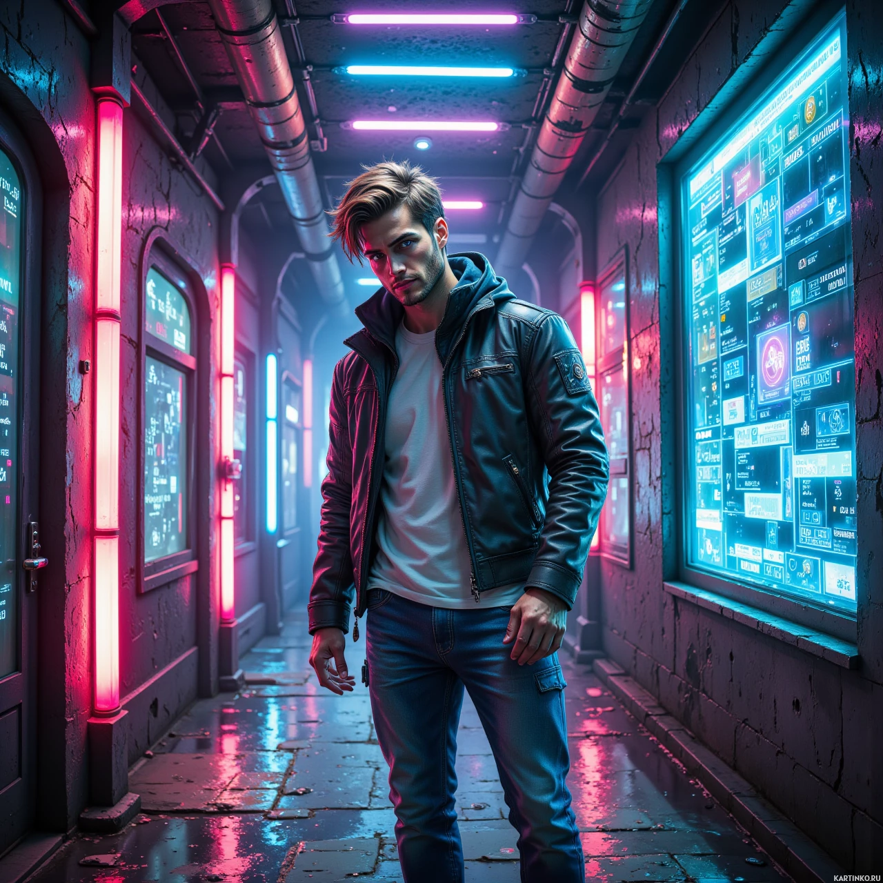 На картинке мужчина стоит в индустриальном коридоре, стены которого украшены электронными панелями, излучающими смесь красного и синего света. На нем кожаная куртка поверх белой рубашки и джинсы. Его выражение лица серьезное или задумчивое, он смотрит в камеру, руки засунуты в карманы. Пол бетонный, кажущийся влажным, что добавляет общей мрачной атмосфере сцены.