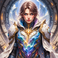 Картинка изображает персонажа, выполненного в художественном стиле фэнтези. Это мужчина-воин с чётко выраженными чертами лица и пронзительными голубыми глазами, которые контрастируют с реалистичной проработкой его лица и одежды. У него волнистые каштановые волосы, и он украшен разнообразными доспехами и аксессуарами, намекающими на высокий уровень мастерства или статус. Доспехи персонажа богато украшены и выглядят как металлическая работа, с замысловатыми узорами, возможно, указывающими на благородное происхождение или королевское происхождение. На нагруднике красуется символ, напоминающий радугу, что добавляет фантастичности его внешнему виду. На заднем плане — открытое пространство с большими круглыми структурами и панелями, создающими ощущение грандиозного входа или портала. Эти элементы добавляют ощущение эпического путешествия или конечного пункта назначения.
