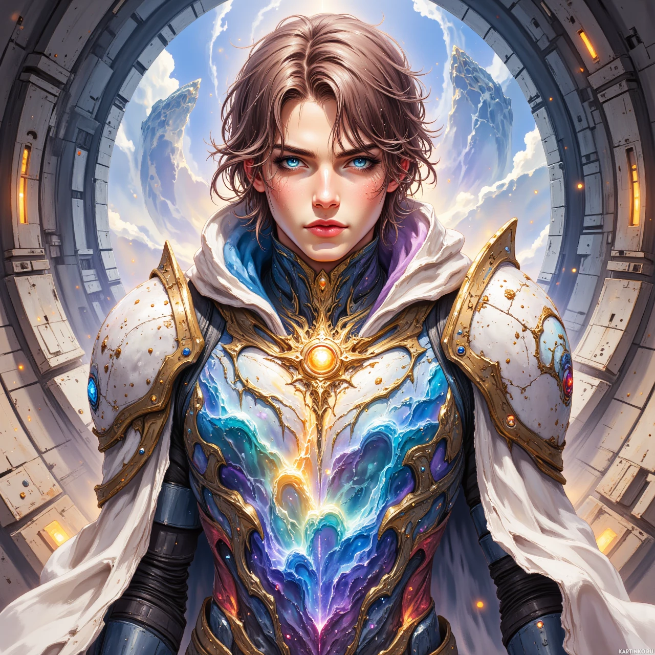 The image portrays a character designed in an artistic, fantasy-inspired style. This character appears to be a male warrior with distinctly defined facial features and striking blue eyes that contrast against the otherwise realistic depiction of his face and attire. He has wavy brown hair and is adorned with various pieces of armor and accessories, suggesting a high level of skill or status within his context. The character's armor is ornate and seems to be made of metal, featuring intricate designs that could be indicative of a noble heritage or royal lineage. The breastplate showcases a rainbow-like emblem at the center, which adds to the fantastical element of his attire. The background consists of an open space with large circular structures and panels, giving the impression of a grand entrance or portal. These elements contribute to the sense of an epic journey or destination. Please note that this description is based on the visible content of the image without any additional context or interpretations beyond what can be directly observed.