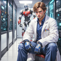На картинке мужчина сидит на скамейке, положив руки на колени. На нём белый халат поверх тёмной рубашки и джинсов. У него серьёзное выражение лица, и он смотрит в сторону, не в камеру. Справа от него стоит робот, напоминающий Iron Man: серебристо-красная броня, светящиеся глаза и механические детали, выдающие передовые технологии. На заднем плане – высокотехнологичная обстановка с большими экранами, на которых отображаются технические данные и схемы, а также ряды компьютерного оборудования.