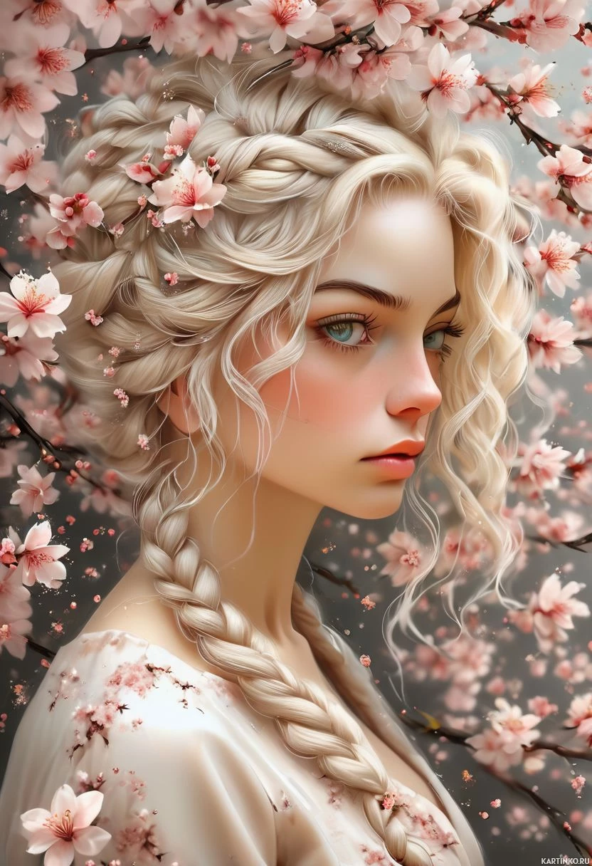 cherry blossoms that seem to be sprouting from her head, creating an enchanting effect. The girl is wearing what appears to be a lace garment with a detailed neckline, suggesting a medieval or fantasy setting. The background is minimalistic, with soft hues and more of the cherry blossoms, which enhances